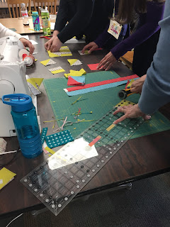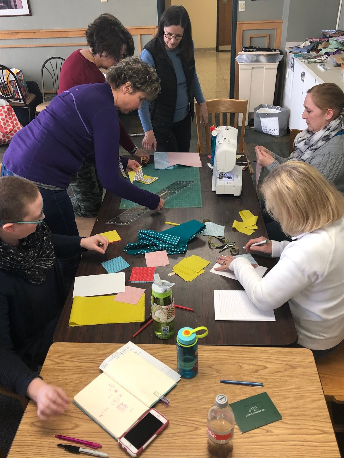 Many members braved the April 14 snowstorm to compete in the CMQG Quilt Olympics! We split into three teams and competed in four categories. We enjoyed guess the fabric designer by their fabric, guess the designer by their photograph and guess the quilt block (thankfully challenges were allowed). Finally each team was given a few fat quarters and told to create as many quilt blocks in a specific design and the size of the block. That’s it, we had to figure out what the block looked like and the cutting dimensions without out the use of our cell phones. Each team was provided a 6×24 ruler, rotary cutter & mat, pair of small snips, an iron and a sewing machine. Our goal was to create as many blocks as possible with good points and accurate dimensions. Thank You to everyone who assisted behind the scenes prior the meeting and throughout the day, this was a team effort with a lot of hands involved. The blocks will be incorporated into quilts for Project Night Night.
