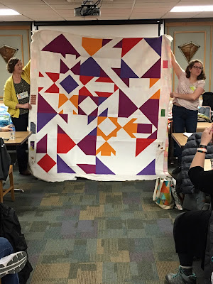 President Amy Struckmeyer and Vice President Heather Kinion presented our guild’s QuiltCon Charity Quilt. The blocks were made by different members and then quilted by member Amy Parker. Heather will do the finishing touches by added the binding and a sleeve. It’s going to BEAUTIFUL hanging at QuiltCon in Pasadena next month. GREAT JOB to everyone that worked on this quilt. Thank you to the following members that pieced the blocks: Carol Allegretti, Lynn Bailey, Jen Beatty, Melissa Bogusch, Kate Brennan, Emily Bruzzini, Julia Bryant, Mary Calzada, Shannon Dangerfield, Erin Davis, Kathy Devries, Sarah Evans, Cari Goode, Holly Harper, Laura Hartrich, Susan Holderread, Bobbie Hopper, Bill Keller, Emily Lang, Jennifer Lowe, Laura McDowell Hopper, Rosalie McMenamin, Dani Miller, Deb Pentek, Sally Prokopec, Brenda Quick, Ilia Raguay, Pat Rahrig, Rachel Rivera, Sarah Shulman, Cathy Sisco, Debi Wight, and Carole Wool. Also thanks to Amy Struckmeyer that pieced the top together, to Amy Parker for the quilting, and to Heather for sewing on the binding and a hanging sleeve. It was announced that after the show, it will be donated to The Las Vegas Modern Quilt Guild for their #quiltsforvegas project.