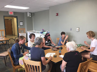 We hosted a summertime schoolhouse. Members broke off into small groups and assisted each other with questions regarding techniques and other quilting related topics. Additional topics were made available if needed. When we reconvened as a large group highlights included our favorite local and on line shops, the thinner the thread the less bulk in your seams, use a laser to assist when squaring up, use painters tape to mark your quilting lines, on a large spool of Aurifil the large circle end is removable. Remove it to change the direction the thread comes off the spool to suit your machine or if you knick the circle and the thread gets caught there, just to name a few.