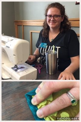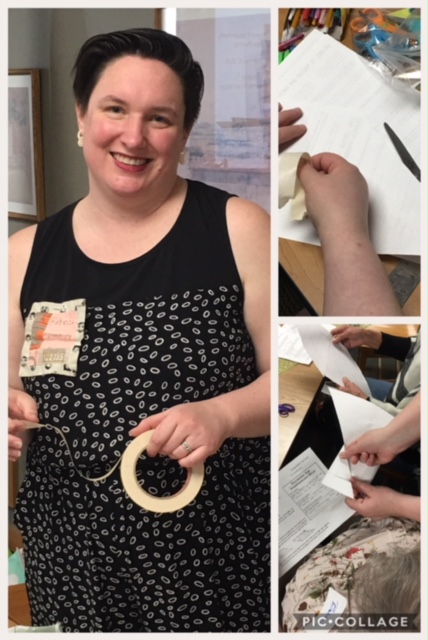 Rebecca Cynamon-Murphy shared with us a method for making continuous bias binding. The method she showed us begins with a rectangle piece of fabric (most techniques have you begin with a square of fabric) and all you need to sew just two seams together. During her demo she had members practicing using a piece of paper and masking tape. For information on the technique Rebecca shared refer to her handout: Continuous Bias Binding.pdf.