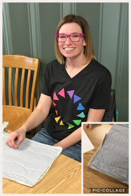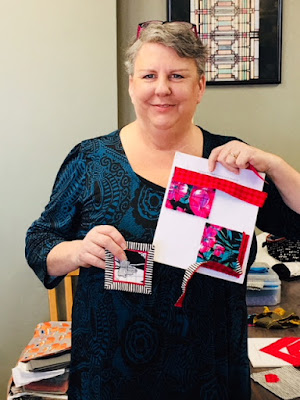 Carole Wool shared with us a technique for making a machine binding with a flange. You will need two fabrics, one as the primary binding fabric and the other as the flange (or accent). Cut the primary binding fabric 1.5” wide and the flange 1 ¾” wide (the length will depend on how much you need for your quilt). Right sides together, sew the strips together lengthwise with a ¼” seam. Press the seam towards the primary fabric. Fold lengthwise with wrong sides together and press. Attach the binding to the BACK side of the quilt. Fold the binding to the front and secure (with pins or wonder clips). From the front of the quilt, stitch in the ditch along the flange to secure. THANK YOU Carole for the samples you provided. It will make things easier for us when we try this technique at home.