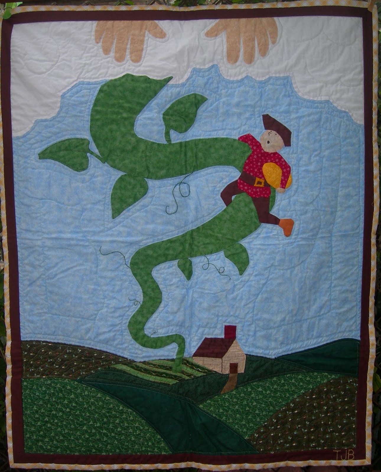 One of my favorite baby quilts – Jack and the Beanstalk. My husband drew the pattern for me full size based on some children’s books and other reference I gave him. I then hand appliquéd and embroidered the top. This was our second quilt we designed together – the first was the Princess and the Pea – and the third fairy tale/nursery rhyme themed quilt.