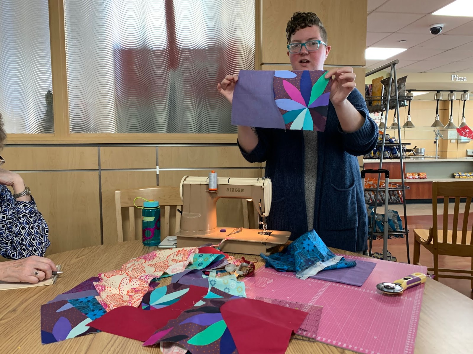 We enjoyed two interview-and-introduce a quilter sessions. First, Natalie Holz and Sarah Evans shared that they have much in common, including old friends and same-age kiddos. Then Donna Moscinski and Lauren Krause shared some hilarious and thoughtful observations. We also had a quilt show-and-tell from one of the guild’s quilting pods. If you’d like to participate in a quilting pod or introduce us to a fellow guild member, reach out to Laura Hartrich: