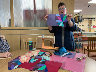 In one demo, she sewed clam shells, and advised we keep the convex curve shape on top, the convex shape on bottom. Be gentle as you sew curves, she said, not pulling or stretching the fabric. When she’s sewing curves, she goes about 1/4 to 1/2 inch at a time and adjusting as she goes. When she’s pressing, she uses steam (others don’t) – proving once again that there’s not just one way to do a thing.