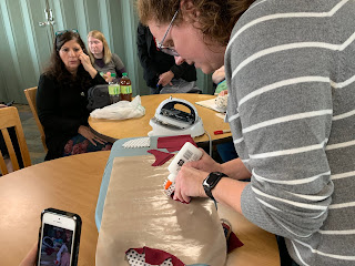 She advised us to not glue baste on a cutting mat; instead, she uses a Teflon Fons and Porter pressing sheet, and then uses her iron to heat set the glue…once you have a stack of heat-set glue basted pieces, they’ll stay ready for you to machine sew indefinitely. Finally, any glue that gets stuck on your iron will peel right off after the iron cools.