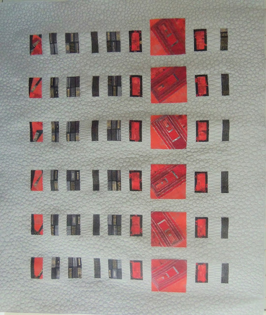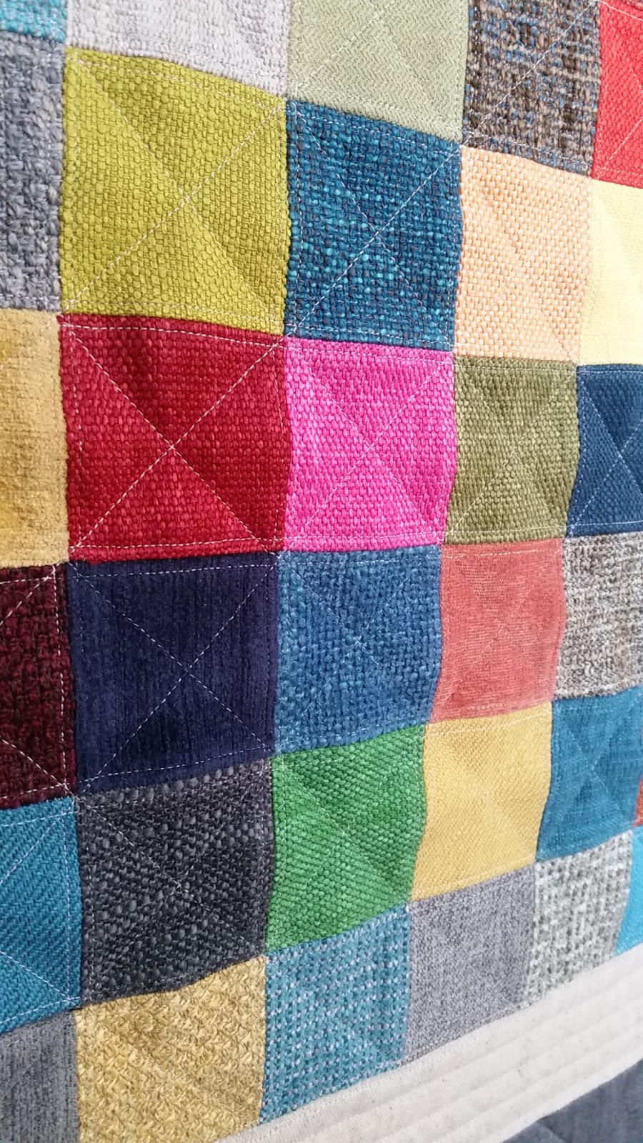 This quilt features authentic reproduction mid-century (1950s) upholstery swatches in a variety of period-appropriate colors, textures and styles. The swatches are juxtaposed against Osnaburg cotton, a background fabric I chose for two reasons: as it has a gorgeous linen-like texture, which complements the colors and textures in the upholsteries, and, because Osnaburg can also be used as an upholstery fabric or upholstery lining.