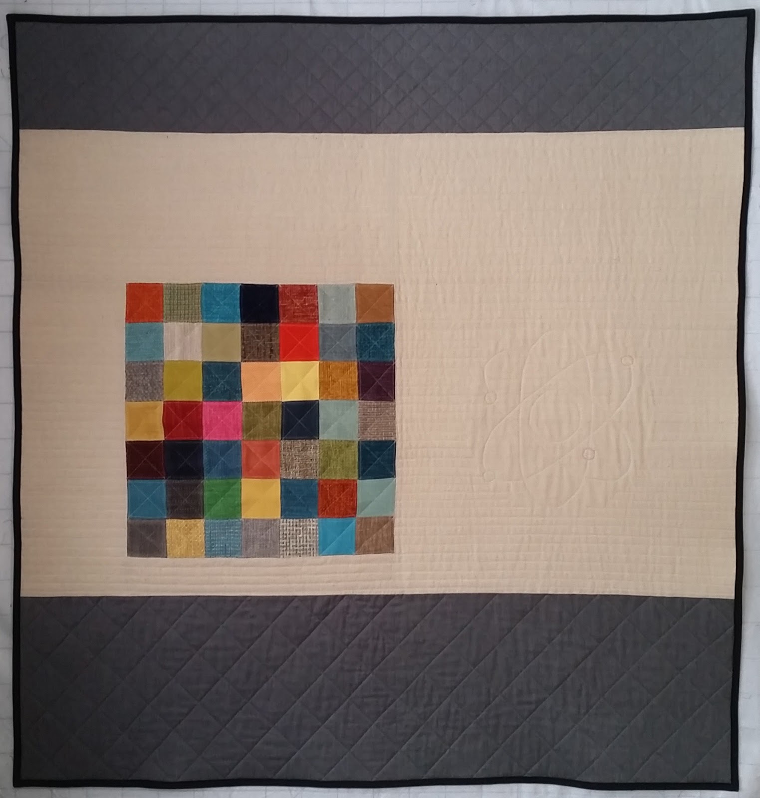 In homage to the simplistic lines and architecture of the mid-century, I kept the quilting minimalist and uncomplicated; the quilted atom to the right of the swatches is a playful throwback to the Atomic Era.