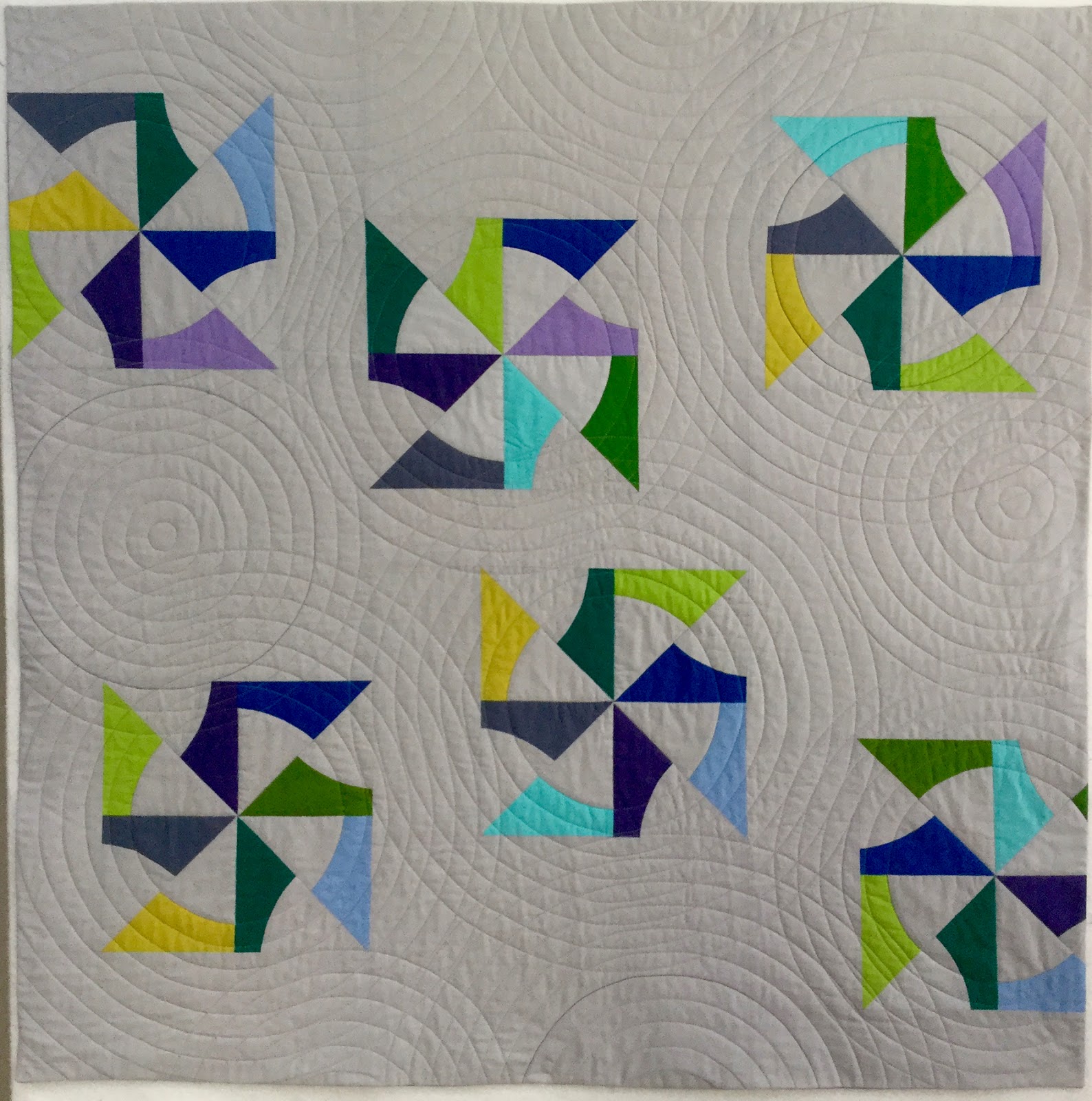 Sarah Shulman’s play with the drunkard’s path block led her to challenge herself to only use drunkards path blocks she had leftover from a previous project. It is called “Disappearing Drunkards Path.” “I pieced them together to make half square triangle blocks and when laying those out on the design wall saw a secondary pinwheel design. I used negative space to define the pinwheels, and I chose concentric circle quilting to further emphasize the circular shapes.”