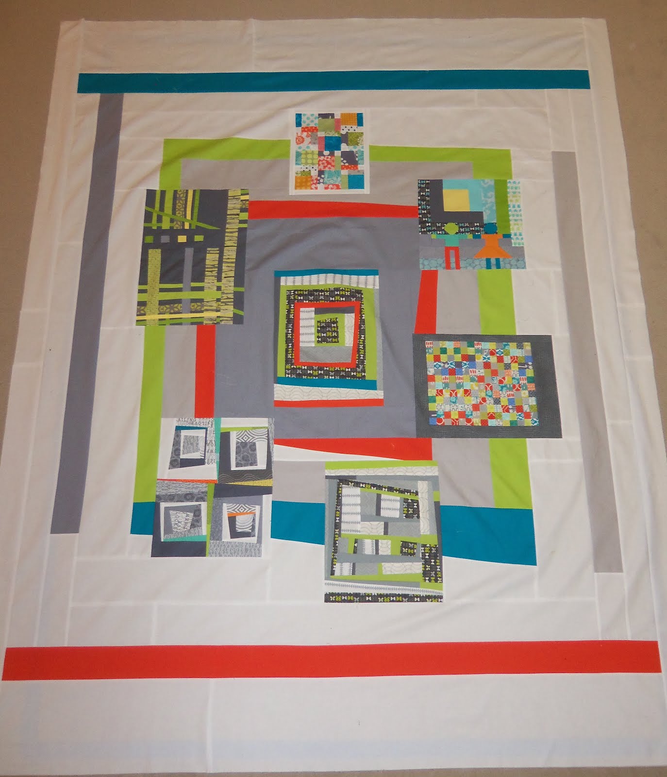 The seven blocks of this quilt were submitted to the Modern Quilt Guild as part of the QuiltCon Block Challenge. The Modern Quilt Guild‘s goal is to put a quilt on every bed of the Austin Children’s Shelter – Austin is where the Modern Quilt Guild is holding its first convention in February 2013. These 7 blocks were sent to the Chicago Modern Quilt Guild for our donation quilt to the shelter. Thanks to a clever layout by Iris Johnson and even cleverer execution of this layout by CMQG Program Chair Sarah Shulman, Debbie Bookman, and Debbie Pine, this top (and look at the wonderful backing), this quilt is ready for quilting. The top and backing have travelled 50 miles from Vernon Hills to Lemont, the home of T and F Quilting Studio and Terri Karls.